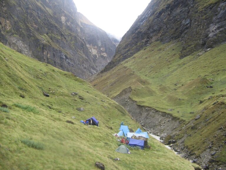 Day 09 – Trek to Chaur bag khola camp (3445m.a.s.l) – 6 to 7 hours walks – Today we have to climb up about 1000 meters to get Chaur bag khola camp because there are not any safe places to set tents and water sources between of Dobhan Kharka and Chaur bag Khola camp. The ascended trail lead us to Chaur bag Khola camp through the moraines and grassy cliffs with charms views of grassy landscapes, rugged rocky hills, Myagdi River valley, snowcapped peaks, glaciers and a beautiful waterfalls just bellow the Puchhar base camp.